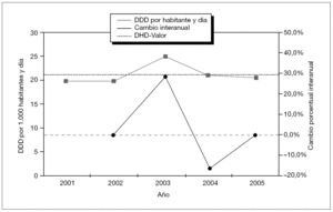 La evolución anual de la prescripción de antibióticos, a lo largo del período de estudio presentó un curso fluctuante con escasa variación durante los años 2001 y 2002 (19,5 DHD), un destacado incremento en 2003 (25,1 DHD) y un posterior descenso y estabilización durante los años 2004-2005 (21,0 y 20,9 DHD, respectivamente). Esta evolución se hace evidente en los cambios interanuales de consumo, produciéndose el mayor incremento en el año 2003 (28,3 %), seguido de la disminución más acusada en el año 2004 (-16,2 %) (fig. 1).