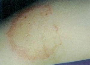 Figura 1. Eritema migratorio característico de la enfermedad de Lyme precoz localizada, situado en el brazo derecho.