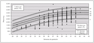 Figura 2. Distribución del peso por edad gestacional, de los 179 niños controles con arteria umbilical única (AUU) con peso y edad gestacional especificados. En cada punto pudo haber más de un niño representado.