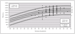 Figura 1. Distribución del peso por edad gestacional, de los 397 niños con defectos congénitos y arteria umbilical única (AUU) que tenían el peso y la edad gestacional especificados. En cada punto puede haber más de un niño representado.