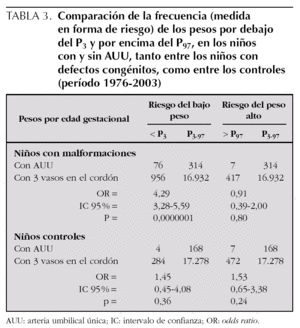 De hecho, en este trabajo, hemos podido constatar que la existencia de AUU en niños sin defectos congénitos no afecta al crecimiento fetal en ninguno de sus parámetros de peso, talla y perímetro cefálico. Incluso las proporciones de los controles que tienen bajo peso para la edad gestacional y los que son prematuros, son similares entre los que tienen AUU y los que tienen 3 vasos en el cordón. Estos resultados confirman las sugerencias de algunos autores que habían analizado un pequeño grupo de niños o fetos con AUU que no tenían otros defectos identificables 26,29. Más aún, en un trabajo muy reciente, Predanic et al 30, consideran que los fetos con AUU aislada tienen el mismo riesgo de ser pequeños para la edad gestacional que los que tienen 3 vasos en el cordón.