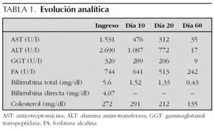 En el seguimiento, las cifras de trasaminasas y bilirrubina fueron descendiendo hasta normalizarse en aproximadamente un mes (tabla 1), la hepatomegalia fue reduciéndose hasta desaparecer y el paciente fue dado de alta sin incidencias.