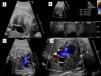 Constricción severa precoz del ductus arterioso. A) Plano de 4 cámaras donde se muestra dilatación de cavidades derechas con abombamiento de la membrana del foramen oval hacia la aurícula izquierda. B) Doppler a nivel del ductus arterioso donde se objetiva flujo continuo con aumento de velocidad en sístole y diástole. C) Insuficiencia tricuspídea severa. D) Plano de la V donde se objetiva disminución del diámetro ductal.