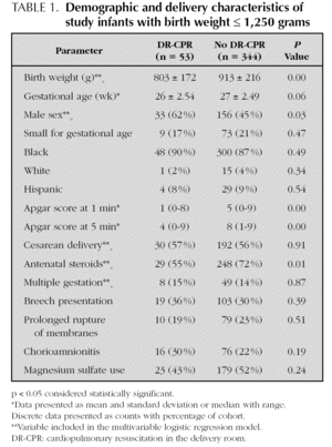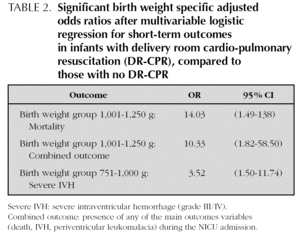 The events surrounding the delivery process have a profound impact on morbidity and mortality of extremely premature infants 1. The incidence of severe intraventricular hemorrhage (IVH), periventricular leukomalacia (PVL) and mortality are all influenced by numerous prenatal and postnatal variables 2,3. Delivery room cardiopulmonary resuscitation (DR-CPR) is an event likely to influence these outcomes but has not been included as a risk factor in short and long-term outcome studies.