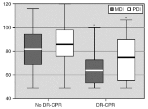 To our knowledge this is the first study that compares long term neurodevelopmental outcomes between infants born ≤ 1,250 grams who underwent DR-CPR and those who did not. Prior studies have been limited to the description of few survivors and their long-term outcomes 13,14. The mean MDI and PDI scores were lower among those exposed to DR-CPR compared to the non-DR-CPR infants. The proportion of infants classified as significantly affected with an MDI score ≤ 70 was also higher in the DR-CPR group when compared to the infants that did not require such intervention, with poor skills such as imitation, vocalization and rudimentary problem solving. Finally, the proportion of significantly delayed infants in areas such as fine and gross motor skills (PDI) was higher among resuscitated infants but did not achieve statistical significance.