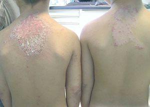 Figura 1. Placas eritematosas y fisuradas en la zona interescapular de ambos pacientes.