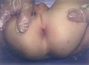 Figura 1. Imagen de la última fisura perianal que presentó el caso 1; siguiendo la esfera de un reloj, su posición sería a las 11:00 h.