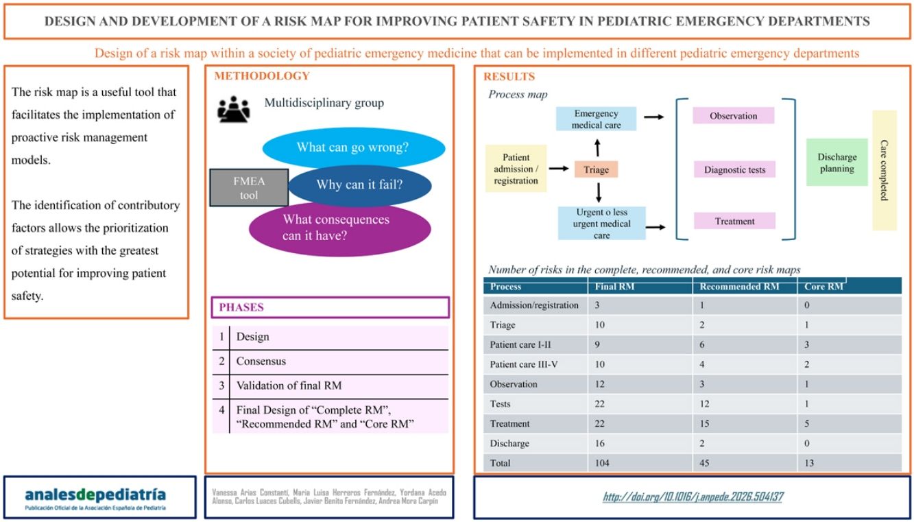 ObjectiveThe aim of the study was to design and approve by consensus a risk map in the framework of the Sociedad Española de Urgencias Pediátricas (SEUP, Spanish Society of Pediatric Emergency Medicine), applicable to PEDs of different characteristics at the national level, that could serve as a reference for proactive risk management to improve patient safety.