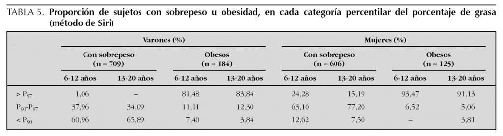 Parece evidente, por tanto, que el IMC es útil, de entrada, para hacer una estimación general de la condición nutricional pero, como se ha puesto de manifiesto en este trabajo, no resulta adecuado para un diagnóstico preciso en todos los casos en los que se presenta sobrepeso u obesidad. La justificación está relacionada con el hecho, aquí demostrado, de que no todas las chicas con sobrepeso por exceso de grasa tienen un valor elevado de IMC y, al contrario, hay chicos clasificados con sobrepeso de acuerdo con el IMC cuyo porcentaje de grasa no es suficientemente alto. Esto posiblemente, como se ha indicado, esté en relación con el marcado desarrollo diferencial de la masa grasa y sobre todo, de la masa esquelética y muscular, cuando comparamos ambos sexos 40,41. Además, como se desprende de algunos trabajos 42 la variabilidad secular del tejido adiposo es mayor que la que afecta a las relaciones talla-peso. Teniendo en cuenta estas limitaciones del IMC a la hora de establecer un diagnóstico preciso del exceso ponderal, se recomienda la utilización añadida del porcentaje de grasa y se proponen, en la tabla 6, los correspondientes patrones actualizados para la población española.