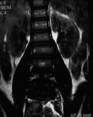 Figura 2.RM: morfología en mariposa de las vértebras lumbares L4 y L5, mostrando un espolón óseo a dicho nivel. Se aprecia además una ausencia de las apófisis espinosas de dichas vértebras lumbares y de los elementos posteriores de las vértebras sacras.