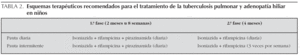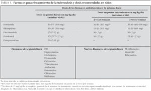 El régimen de elección para el tratamiento de la TB pulmonar en niños, sin factores de riesgo de resistencia, es una pauta diaria de 2 meses o 56 dosis de isoniazida+rifampicina+pirazinamida, seguido de 4 meses o 126 dosis de isoniazida + rifampicina.