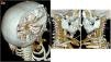 Reconstrucción 3DVR. 2a. Extensa craniectomía descompresiva frontoparietotemporal derecha. Ausencia de visualización de segmento cavernoso y clinoideo de arteria carótida interna (ACI) derecha con leve asimetría de arteria cerebral media y subdivisiones superior e inferior respecto al lado contralateral. 2b. Imagen de stop ACI derecha posbifurcación segmento C2 de morfología afilada con oclusión progresiva («signo de la llama») acorde con disección carotídea. 2c. Trayecto y morfología normal de ACI izquierda.