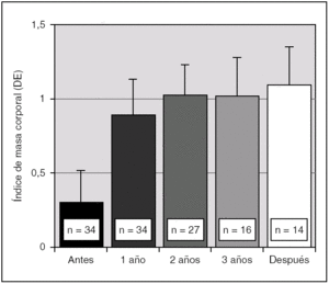 Durante el tratamiento con análogos de GnRH se evidenció un aumento significativo del IMC, que se mantuvo un año después de finalizar el tratamiento (fig. 3). Así mismo, antes del tratamiento, un 10 % de las pacientes presentaron un IMC superior a 2 DE para la edad y sexo, mientras que tras un año de terapia ese porcentaje aumentó a un 16 %; a los 2 años se mantuvo igual; a los 3 años de terapia era de un 18 %, y un año después de suspender el tratamiento era de un 20 %.