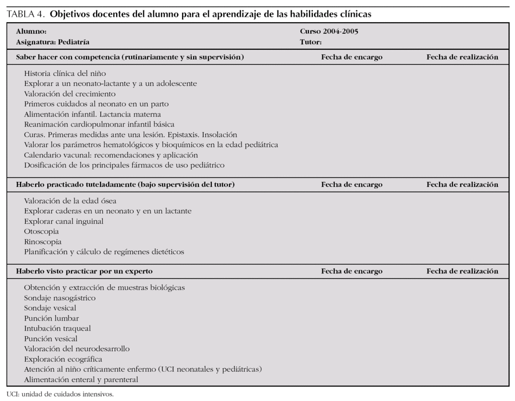Para lograr las habilidades clínicas los alumnos debieron realizar el programa de prácticas y se les proporcionaba a cada alumno una ficha con los objetivos que debía alcanzar (tabla 4), lo que a su vez debería certificar su tutor. Cada alumno tenía 4 semanas de prácticas.