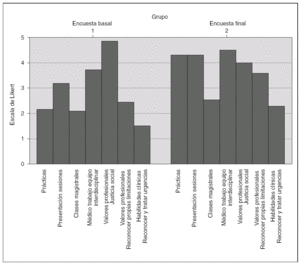 Al finalizar el curso y tras conocer sus calificaciones, hubieron variaciones en las percepciones respecto al proyecto de innovación docente, tal como se refleja cuando ciertas preguntas se repitieron en las diversas encuestas realizadas. Así recordemos que los alumnos estimaron (tabla 1 y fig. 1) que en el segundo cuatrimestre habían mejorado sus prácticas, la docencia teórica, su autoaprendizaje, su capacidad para ejercer la medicina y presentar una sesión clínica, si bien sólo fueron estadísticamente significativas las diferencias respecto las prácticas, la docencia teórica y su capacidad para presentar sesiones clínicas.
