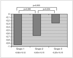 El ANOVA mostró una diferencia con significación estadística (p < 0,05) en z-DMO entre los 3 grupos. Las comparaciones post hoc demostraron que esta significación se alcanzaba a expensas de la diferencia entre asmáticos con tratamiento y sanos, con un exceso de 0,19-1,15 z-DMO (IC 95 %) de los sanos sobre los asmáticos con tratamiento; mientras la diferencia entre asmáticos con y sin tratamiento, y entre asmáticos sin tratamiento y sanos, no alcanzó la significación. La variación de z-DMO en cada grupo y los resultados de las comparaciones entre ellos se representan en la figura 1.