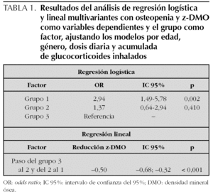 Los resultados de los análisis de regresión logística multivariante empleando la condición de osteopenia como resultado y al grupo como probable factor de riesgo a ella, ajustando los modelos por edad, género, dosis diaria y acumulada de GCI, se muestran en la primera sección de la tabla 1. Como se observa, los asmáticos del grupo 1 tienen un riesgo relativo de padecer osteopenia incrementado en casi tres veces respecto a los niños sanos del grupo 3, mientras no se observa ningún aumento de riesgo a padecer osteopenia entre los niños asmáticos sin tratamiento del grupo 2 respecto a los sanos del grupo 3.