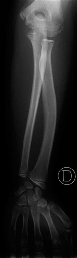 Figura 3. Radiología de antebrazo y muñeca del hermano, de 13 años.
