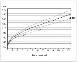Figura 1. Evolución del crecimiento. TD: talla diana o genética (referencias auxológicas: Hernández et al. Fundación Orbegozo, 1988).
