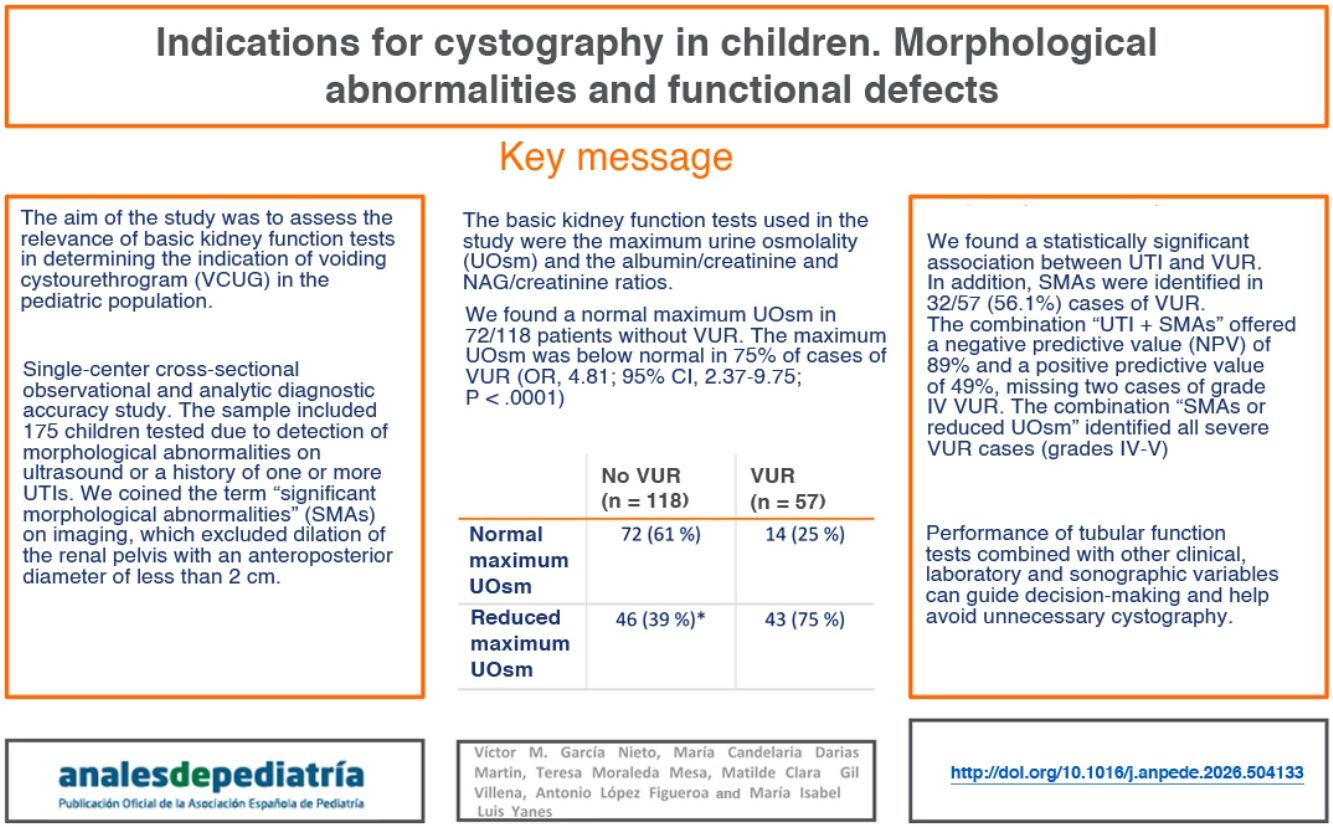 ConclusionsIn children who have had UTI, in the presence of SMAs, prior determination of the maximum UOsm does not seem necessary to indicate a cystography. In patients who have not suffered from UTI, determining the maximum UOsm is useful for ruling out the presence of severe VUR. Renal tubular function tests, combined with other clinical, laboratory and sonographic variables, can guide decision-making to avoid unnecessary cystography.
