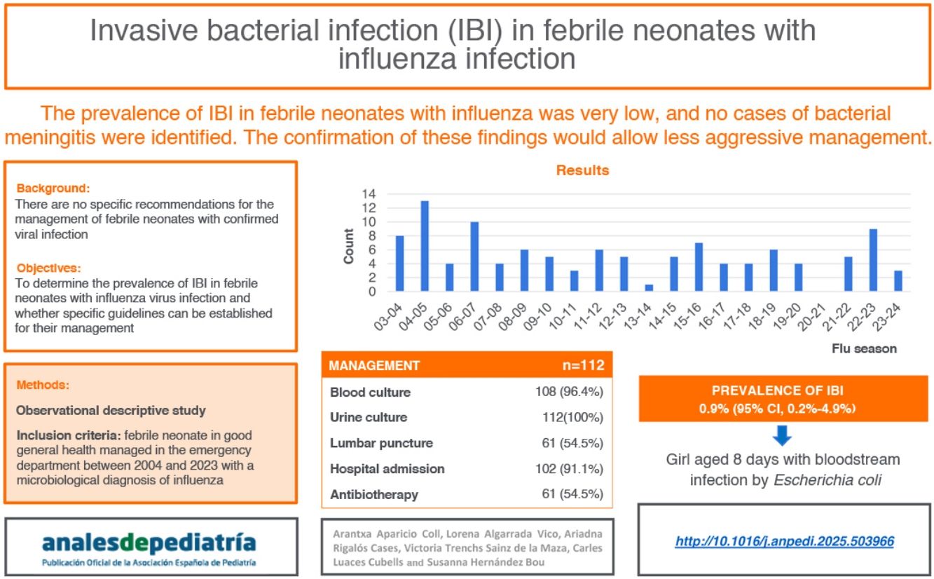 ConclusionsThe prevalence of IBI in febrile neonates with influenza infection is very low, with no detection of cases of bacterial meningitis. Confirmation of these results in a multicenter study, which could also identify associated risk factors, would allow a less aggressive approach of low-risk patients.