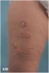 Paciente de 20 meses, sin antecedentes patológicos, que consulta en Urgencias por lesiones cutáneas de 15 días de evolución. En la exploración (figs. 1-2) se objetivan vesículas y ampollas tensas agrupadas alrededor de máculas o costras, dando un aspecto de roseta. Está afebril, sin afectación mucosa. Niegan ingesta de fármacos o vacunación reciente.