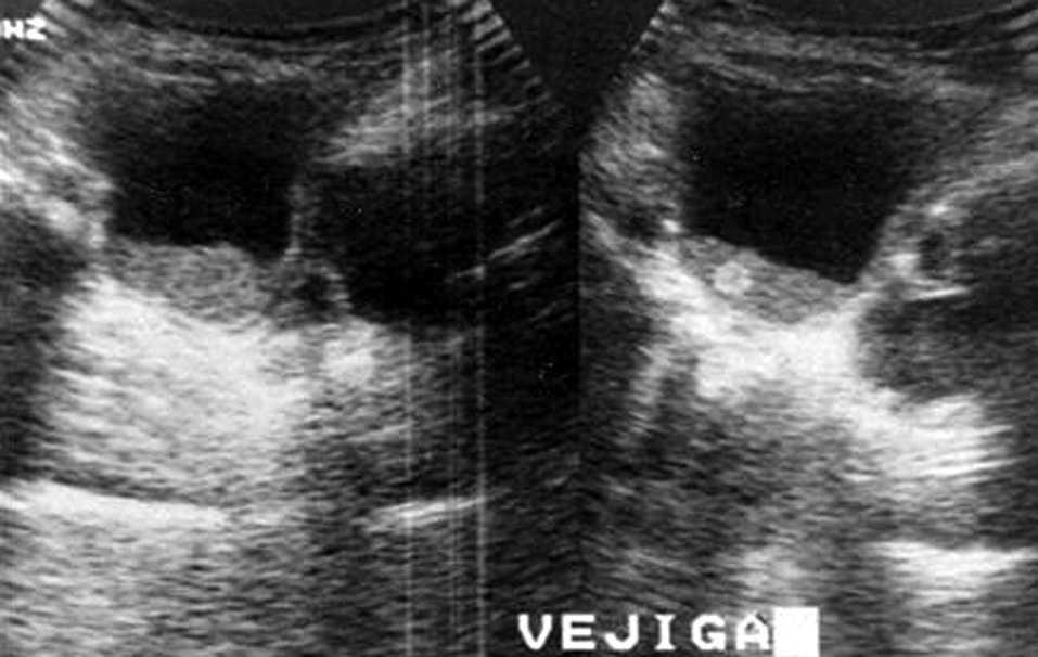 Figura 2. Ecografía de uréter izquierdo dilatado con múltiples glóbulos ecogénicos en su interior.