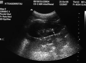 Figura 1. Ecografía renal: cálculo en grupo calicial inferior del riñón izquierdo (flecha color blanco).