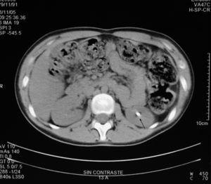 Figura 2.TC helicoidal sin contraste intravenoso. Cálculo en grupo calicial inferior del riñón izquierdo (flecha color negro).