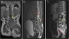 We present the case of a girl aged 2 years brought in for evaluation of lower back dimples and spinal hemangioma diagnosed at birth. She presented with progressive paraparesis with onset 2 months prior, muscle atrophy in the lower extremities, constipation and a tendency to urinary retention and a bulging mass under the hemangioma. The magnetic resonance imaging (MRI) scan showed a large intraspinal mass around the conus medullaris extending into the presacral space with cystic lesions and heterogeneous enhancement (Fig. 1). The complete blood count was normal, with negative results for serum alfa-fetoprotein β-HCG.