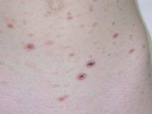 Figura 2. Detalle de las lesiones papulonecróticas localizadas en región abdominal. Se observan las pápulas liquenoides cómo están cubiertas por escamas adherentes con un collarete descamativo.