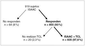 Se entregó el cuestionario ISAAC (el apartado del asma) a 919 niños, distribuidos en 465 niños (50,6 %) y 454 niñas (49,4 %). La edad media fue 8,17 ± 1,66 años (DE), rango 6-12 años. Respondieron al cuestionario ISAAC 855 niños (93 %). En el grupo de no respondedores (n = 64) (6,9 %) se encontraban los que no cumplimentaron correctamente el cuestionario y los que cuyos padres no autorizaron el estudio. No realizaron el TCL 20 de los niños que contestaron correctamente el cuestionario ISAAC. La distribución de la muestra aparece en la figura 1.