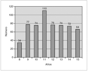La edad media fue 11,7 años, 231 mujeres (39,8 %) y 350 varones (60,2 %). La relación varón:mujer es superior a la relación de masculinidad en nuestro medio (106:100) debido a la mayor proporción de varones en dos de los centros participantes. La distribución por edades se reseña en la figura 1.