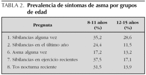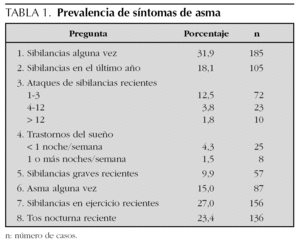 La prevalencia de síntomas de asma obtenida mediante el cuestionario se presenta en la tabla 1.