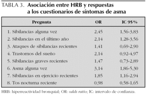 La evaluación de la HRB continúa siendo útil como complemento a los cuestionarios ya que desempeña un papel muy importante en la identificación de grupos con anormalidad fisiológica reconocible. Así, proporciona información adicional descubriendo a los sujetos que son asintomáticos pero que tienen una respuesta anormal de la vía aérea. Estos sujetos comparten un pronóstico menos favorable y con mayor morbilidad, junto con los individuos que presentan una HRB sintomática 31 y, por tanto, no deberían ser clasificados simplemente como no asmáticos como ocurre con el empleo único de los cuestionarios. Por ello, se ha propuesto que la medición de HRB se combine con las respuestas a los cuestionarios para definir las subpoblaciones de asmáticos 4,30, aquéllos con enfermedad leve o inactiva y, por otra parte, los que padecen una enfermedad grave con propensión a la HRB.