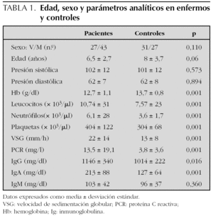 En todos los niños, casos y controles, se realizó una exploración física completa y los siguientes estudios de laboratorio: hemograma, velocidad de sedimentación globular (VSG), proteína C reactiva (PCR), orina elemental, bioquímica básica, estudio de coagulación y determinación de inmunoglobulinas (IgG, IgA, IgM).