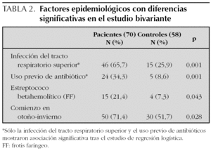 Es frecuente encontrar el antecedente de infección de vías respiratorias altas entre los pacientes con PSH11,20 El estreptococo betahemolítico es el agente infeccioso más implicado12,21,22. También se ha relacionado con M. pneumoniae, Legionella, Yersinia, H. pylori, Haemophilus parainfluenza, Bartonella henselae, así como con el virus de la varicela, VHB y VHC, rubéola, sarampión, CMV, parvovirus B19, adenovirus y VEB entre otros23-27. En el presente estudio los pacientes tuvieron ITRS en un porcentaje significativamente mayor que en los controles (65,7 % frente a 25,9 %). El estreptococo betahemolítico se encontró en mayor número de pacientes que de controles, pero estos resultados no alcanzaron significación estadística en el estudio multivariante.