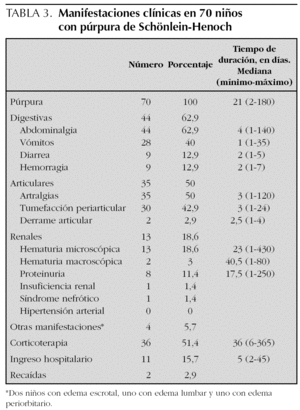El tiempo mínimo de seguimiento en los enfermos fue de 3 meses si la púrpura se había resuelto y no existían alteraciones analíticas. En los casos de hematuria o proteinuria el seguimiento continuó hasta 3 meses después de su desaparición o de forma indefinida en caso contrario.