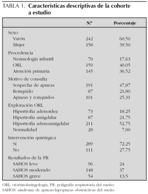 Se ha analizado una cohorte constituida por 400 pacientes estudiados con PR del sueño, 159 casos (40,05 %) remitidos desde consultas externas de ORL, 145 casos (36,52 %) de AP y 70 casos (17,63 %) de la UNI. La edad media de la cohorte fue de 4,95 años (desviación estándar [DE}: 2,3), distribuida por sexos en 242 niños (60,5 %) y 158 niñas (39,5 %).