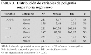 Las variables cuantitativas analizadas han sido la edad, número total de apneas (n.º A), número total de hipopneas (n.º H), índice de apneas por hora (A/h), índice de hipopneas por hora (H/h), índice de apneas-hipopneas por hora (IAH/h), SpxO2 medio, SpxO2 mínimo, número de ronquidos (n.º R) e índice de ronquidos por hora (IR/h). Las apneas centrales registradas se han excluido en este estudio.