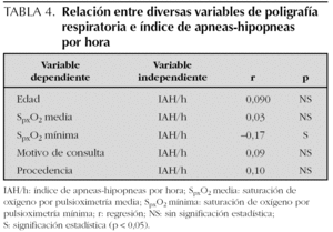 Los resultados de la PR del sueño expresados en medias y desviación estándar son los siguientes: n.º A 21,38 (24,47); n.º H 19,81 (20,74); IA/h 2,58 (2,93); IH/h 2,37 (2,46); IAH/h 5,29 (7,10); SpxO2 medio 94,60 (11,80); SpxO2 mínimo 83,14 (13,45); n.º R 98,27 (254,55) e IR/h 5,68 (6,5). Se han encontrado diferencias estadísticamente significativas entre la saturación de oxígeno mínimo y el IAH/h; por cada incremento unitario en IAH/h disminuye la saturación en un 0,18 % (r = 0,17). Así mismo, se ha hallado asociación entre n.º A, n.º H, n.º R e IR/h y el motivo de la consulta (tabla 2). No se han encontrado diferencias entre IAH/h, N.º R e IR/h y sexo (tabla 3). Tampoco se ha encontrado asociación entre edad, saturación de oxígeno medio, procedencia, motivo de consulta e IAH/h (tabla 4).