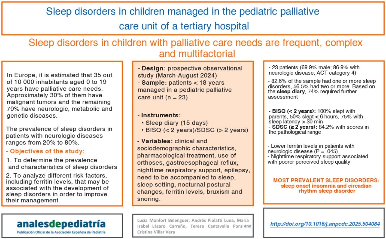 Thus, we conducted a study with the aim of establishing the prevalence and characteristics of sleep disorders in a pediatric palliative care unit and to analyze associated risk factors (including ferritin levels) in relation to the patient's disease, for the ultimate purpose of optimizing clinical management and improving the quality of life of children and their families.