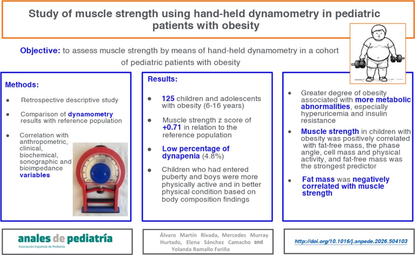 ResultsThe sample included 125 patients (mean age, 12.06 years; 50.4% female; body mass index [BMI] Z-score, 3.87 [SD, 1.46]). Male participants were less severely obese and had a healthier body composition. Prepubertal patients were less physically active and had a higher fat mass (FM) percentage. The prevalence of metabolic comorbidities, such as hyperuricemia and insulin resistance, increased with the degree of obesity. Children with obesity had a mean muscle strength Z-score of +0.71 in the dominant hand, with differences based on sex and stage of pubertal development. We found dynapenia in 4.8%, with a greater prevalence in prepubertal children. Muscle strength was positively correlated to physical activity, fat-free mass and phase angle and negatively correlated to FM percentage. Fat-free mass was the strongest predictor of muscle strength.