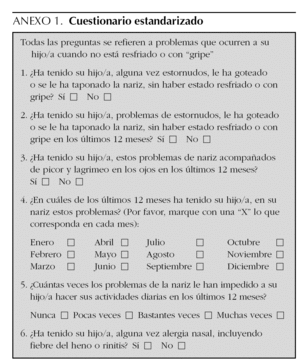 Los criterios de valoración de las respuestas han sido los siguientes: la respuesta positiva a la pregunta 1, se clasificó como rinitis alguna vez; la respuesta positiva a la pregunta 2, como rinitis en los últimos 12 meses; la respuesta positiva a la pregunta 3, como rinoconjuntivitis en los últimos 12 meses; en la pregunta 4 se mide los meses de afectación; en la pregunta 5, todas las respuestas, excepto "nunca" se consideraron positivas en cuanto a tener problemas de la nariz que han impedido al niño/a hacer sus actividades diarias en los últimos 12 meses. La respuesta positiva a la pregunta 6 se definió como alergia nasal alguna vez.