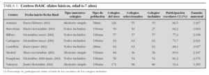 Las características básicas del estudio en cada centro se recogen en la tabla 1, tomando parte un total de 25.113 escolares. De los colegios seleccionados, todos se incluyeron en el estudio, menos dos colegios en Pamplona (3,8 %), 18 en Valencia (18,4 %) y 23 en Barcelona (46 %), que rehusaron. La participación de los escolares fue superior al 70 % en todos los centros, salvo en Valencia, donde no se alcanzó el 60 %, y la mediana fue del 81,7 %. En Asturias, Madrid y Valencia se realizó un muestreo aleatorio simple para la obtención de la muestra de colegios; en los demás centros, fueron incluidos todos los colegios del área. Barcelona y Asturias concurrieron por primera vez en este grupo de edad.