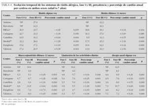 En la tabla 4 se observa la evolución temporal de la rinitis alérgica, comparando el cambio porcentual anual en cada centro. Para rinitis alguna vez ocurrió un descenso en Bilbao y Cartagena, pero en los demás centros y para todas los demás síntomas, las prevalencias se incrementaron y, en general, de forma significativa. Destacó Madrid con los mayores cambios anuales, que alcanzaron el 1,28 % en rinitis alguna vez y el 1,16 % en rinitis en el último año. Así mismo, la limitación de actividades aumentó en todos los centros.