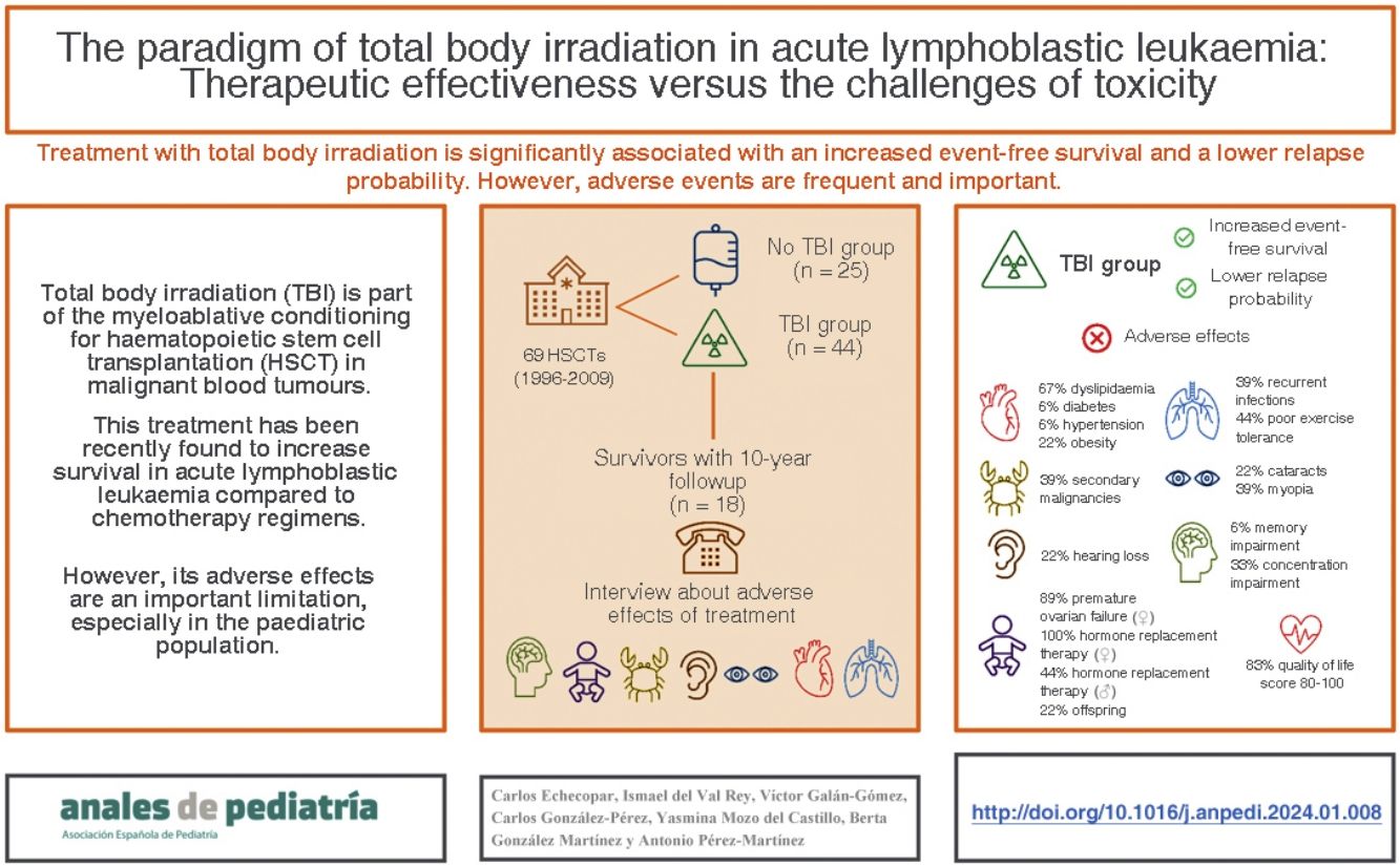 Although the use of TBI as part of the conditioning regimen for HSCT in childhood ALL is still recommended,24 TBI has significant associated toxicities in the medium and long term. However, current chemotherapy-only conditioning regimens are clearly inferior, so randomised controlled trials should be conducted to explore the possibility of combining them with other post-transplantation strategies to intensify the anti-leukaemia effect without increasing toxicity, for instance, through the use of drugs such as tyrosine kinase inhibitors or immunotherapy with adoptive cell transfer.
