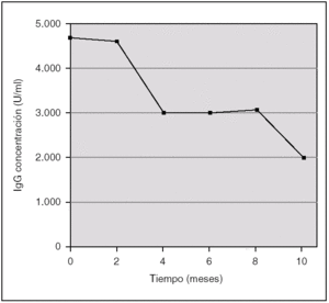 Los valores de IgG, IgM e IgA permanecieron reactivos en valores elevados (fig. 1), excepto un paciente que negativizó la IgM específica al quinto mes y dos la IgA específica a los 5 y 12 meses.