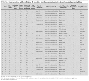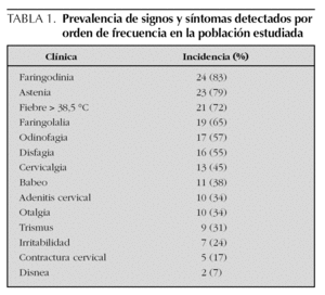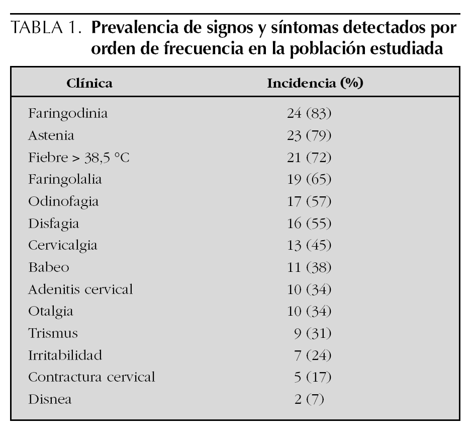 En el período de 6 años estudiado fueron atendidos un total de 29 niños en la Unidad de Urgencias Pediátricas en colaboración con el Servicio de Otorrinolaringología que consultaron por sintomatología congruente con IPA. Hubo un predominio del sexo masculino con una relación 1,6:1, y la edad media era de 7,4 ± 1,6 años, con un rango comprendido entre los 4 y los 11 años. El cortejo de signos y síntomas detectados en los niños afectados se refleja en la tabla 1, y son el dolor de garganta, la astenia y la fiebre los hallazgos más comúnmente presentes.