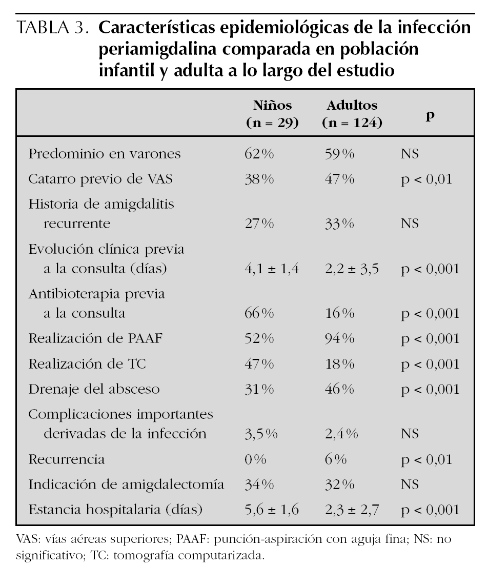 TABLA 3. Características epidemiológicas de la infección periamigdalina comparada en población infantil y adulta a lo largo del estudio